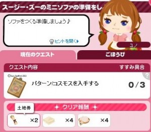 このクエストは、スージー・ズーのミニソファーを5つ作らないといけません。
